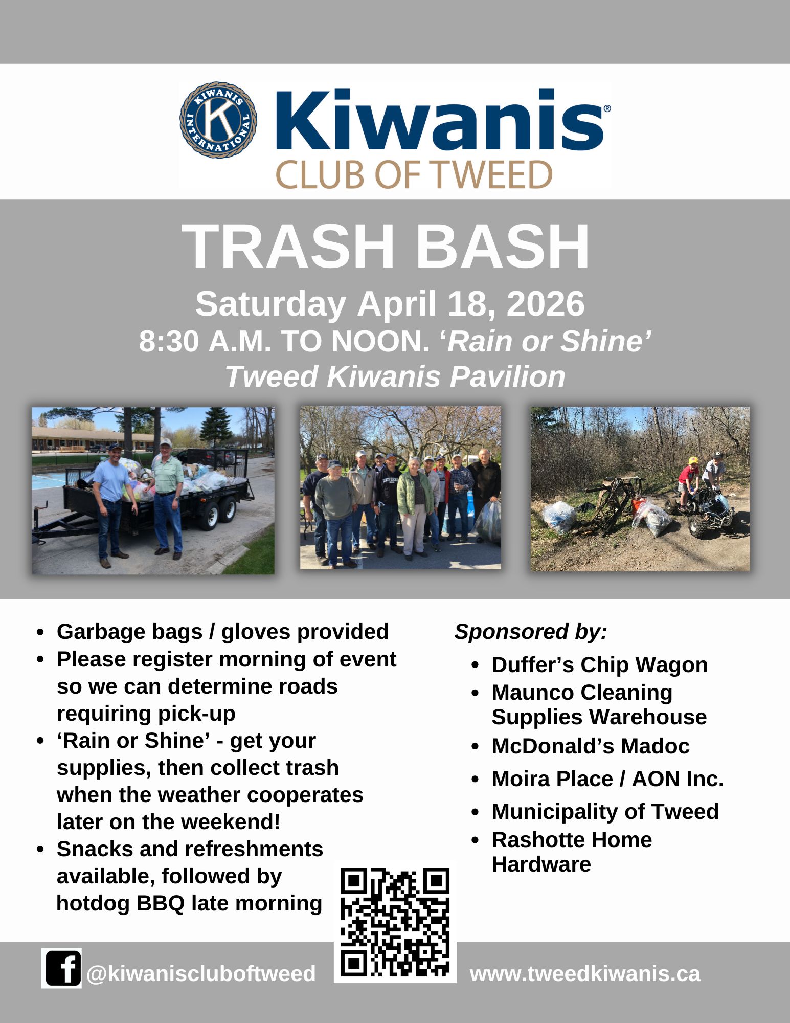 Mark your calendars for this year’s Trash Bash: SATURDAY APRIL 18, 2026, 8:30 AM to NOON, KIWANIS PAVILION, TWEED MEMORIAL PARK Gloves and bags provided. Rain or shine...Snacks, refreshments all morning, hotdog BBQ. We need you tell us your pick-up area so the Municipality can pick up the bags the following week! ... See MoreSee Less
